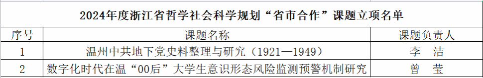近日,浙江省哲学社会科学工作办公室发布了《关于公布2024年度浙江省哲学社会科学规划“省市合作”课题立项项目名单的通知》(浙社科版〔2024〕38号),小黄书 共有2个项目获批立项。