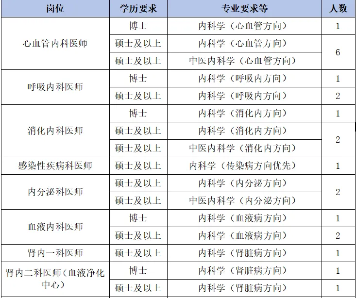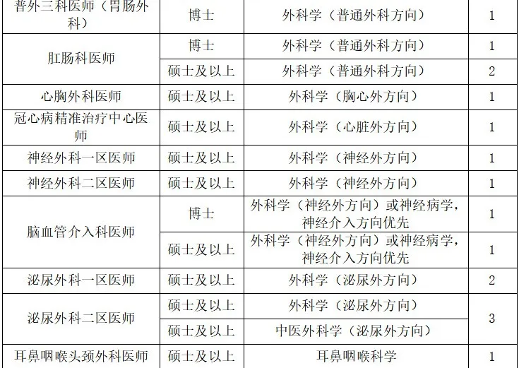 1、具备全日制硕士研究生及以上学历和学位(初始学历须为国家统招本科起点),各岗位学历及专业要求详见“招聘岗位表”,需要取得住院医师规范化培训合格证书或2025年住培结业即可取得住院医师规范化培训合格证书。