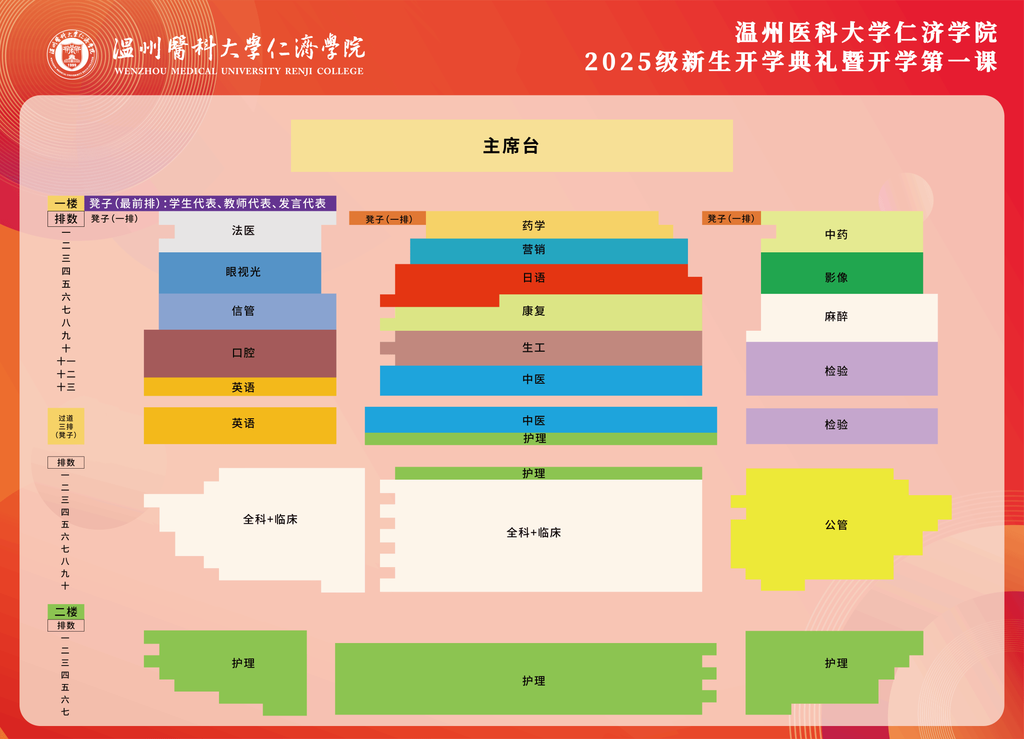 2.届时各班级以班级为单位集中前往会堂,于13:20前进场完毕并在指定位置有序就坐(见会场座位示意图);
